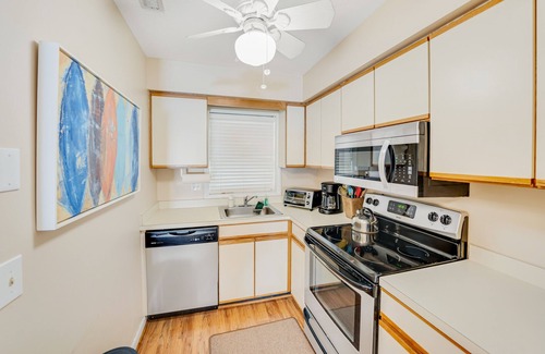 This home provides access to an on-site community pool for extra fun. Return to your home away from home after a lively day. The first floor of this two-story townhome features an open living, dining, and kitchen area, along with a patio and powder room. From there, a spiral staircase leads to two upstairs bedrooms, a second-floor deck, and a shared bathroom.
