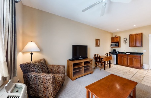 The living space is simple and comfortable, bringing together the living room, a small dining space, and a kitchenette with a mini fridge, a microwave, and a coffee maker to enjoy each morning. There are air-conditioners beneath the windows to use in the peak of summer, WiFi throughout the suite to keep you comfortable and connected, and a pair of cable TVs for your at-home entertainment - one in the living room and another in the bedroom.