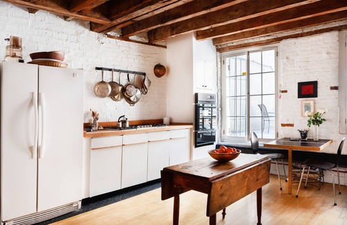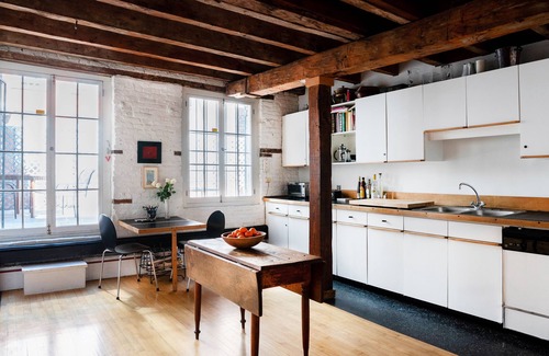 Both floors boast wood beamed ceilings and are light-filled and sparely furnished, with a mix of modern pieces and Danish antiques. The loft has an open plan, so the kitchen, dining and living rooms flow into each other. The top floor, which doubles as an artist’s studio, has a soaring cathedral ceiling with skylights and serves as a large and dramatic master bedroom. There is an elegant bathroom- cum- marble shower (with a rain shower) off of the master bedroom, as well as a second bedroom, which works well for children. The third bedroom is on the living floor below and adjoins the bathroom downstairs, which has a separate bath and shower. No elevator.