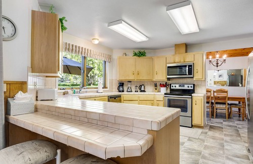 Come to Ketchum for a family getaway and stay in this four-bedroom home with mountain views in the Board Ranch neighborhood. You'll enjoy a large yard, easy slope and town access, lots of toys and games, and ample parking, including a three-car garage and a large parking area for RVs and ATV trailers. This charming vacation rental is a multi-generational property with something for everyone to enjoy! Well-equipped with Ping-Pong, flag football, badminton, frisbees, snowshoes, a Pack-n-Play, and a child's booster seat, this home is perfect for families of all sizes and ages. You'll also have free WiFi, Netflix-ready TV, a private washer/dryer, a fully equipped kitchen, and two large decks for summer cookouts!