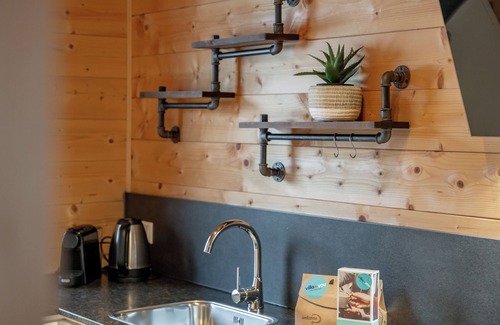 Ground floor: (Living room(TV, dining table(6 persons), seating area), open kitchen(hob, electric kettle, hood, coffee machine(filter), oven, dishwasher, fridge-freezer), bathroom(shower, washbasin), toilet(washbasin, toilet), terrace)