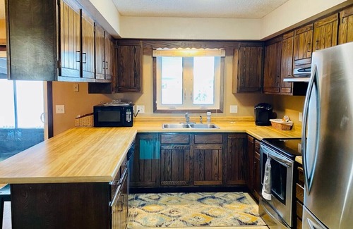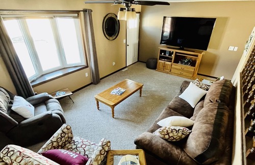 Relax with the whole family at this peaceful place to stay. Within walking distance of restaurants, bars, gas station, grocery store, & fun. Great hunting, fishing, Crossroads 18 hole golf course. This home offers many gathering areas with a large outdoor patio & back yard with a screened in porch. 70in TV with Hulu, Disney+, & Amazon movies. Bonus basement room with a ping pong table! All the benefits of small-town hospitality with big hearts.