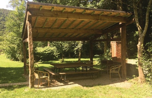 The cottage is located in an idyllic valley, 25 km south of Dinant and right on the French border. It stands on a wooded plot of 25,000 m2. In the fenced garden flows the shallow stream La Houle. You will also find some playground equipment and a few benches. The children can play to their hearts' content in the woods or on the large lawns. On the terrace at the front of the house you can enjoy the midday sun in the cozy sitting area. The other terrace with gas grill is located in front of the kitchen on a lower level. In the summer months you can enjoy your meals together outdoors at the large garden tables. If the weather doesn't want to cooperate, just make yourselves comfortable together in the kitchen. Evenings are always too short by the fireplace in the cozy living room. The large table in the elegant dining room next to it, is also wonderful for playing board games. The bedrooms on the first and second floor are all equipped with their own bathroom. The television can be used for DVDs only. The cottage is an ideal vacation accommodation, where you will spend a relaxing and restful stay. This house is mainly intended for families. However, other groups can be accepted with the consent of the owner and with a possible increase of the deposit. Groups of people under 30 years of age are generally not allowed.