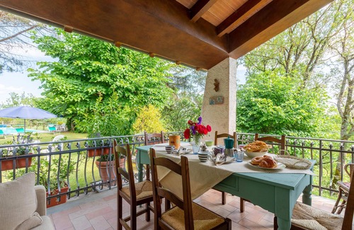 Near Monte S. Maria in Tiberina (5 km) is this country house in a quiet hillside location with pool. In front of the upper living room with kitchen is a covered terrace, another covered terrace seating area with barbecue is located in the well-kept garden plot. The interior is cozy-rustic, the bathrooms are simple (with open showers). Ideal for vacationers seeking tranquility and closeness to nature; discover the small picturesque hill towns in the area: Monterchi and Citerna (20km), Città di Castello (11km). Other recommended destinations can be reached within an hour's drive: Cortona and Castiglion Fiorentino (about 40km), Arezzo, Perugia and Assisi (about 60km). Stores in the hamlet of San Secondo (5km), Ristorante with panoramic view in Monte Santa Maria Tiberina.