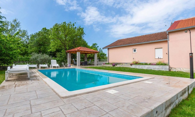 This nice vacation home with pool is surrounded by flowers and ideal for a carefree vacation away from the city bustle. The house is located on a large fenced plot, so the children can play carefree. You can sunbathe by the pool or prepare barbecue meals. The living area and recreation room is separate from the quiet sleeping area and accessible from the outside. Leave your worries behind and enjoy the nature that surrounds the house. Nearby are Sinj, famous for the knight game Sinjska Alka and Split, the metropolis of Dalmatia with a historic old town center and Roman palace.