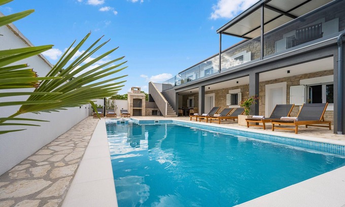 Enjoy a relaxing holiday in your modern holiday home in Plastovo, a charming village not far from Krka National Park. This elegant house offers you a touch of luxury. Relax on the large terrace, which is equipped with a spacious pool and comfortable sun loungers. Start your day with a refreshing dip in the cool water and enjoy the peaceful surroundings. The stylish interior of the house invites you to linger. Make yourself comfortable on the cosy sofa in the living room and enjoy the modern furnishings. You can prepare your favourite dishes in the well-equipped kitchen and enjoy them at the dining table with family or friends.