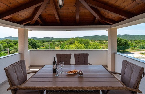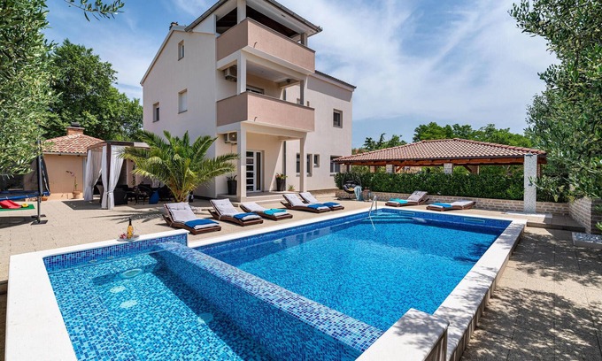 Radainovci is a typical, picturesque Dalmatian village near Lake Vrana and not far from the attractive town of Biograd na Moru. This beautiful and modernly equipped holiday home is located here. It consists of two comfortable and spacious flats connected by an internal staircase. On the well-kept property there is an outdoor kitchen with barbecue, outdoor play facilities and a pool for lots of fun and real refreshment. On the second floor there is a sauna and a fitness room as well as a smaller kitchen. The terraces are ideal for cosy get-togethers with a glass of your favourite drink while enjoying the beautiful scenery and sunsets. Due to the proximity to the main transport points, the Krka, Paklenica and Plitvice Lakes National Parks can be reached quickly. All of them offer unique natural beauty.