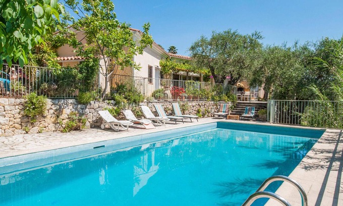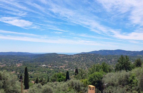 This vacation home with pool and panoramic views in the Alpes-Maritimes is located in a quiet lane, 25 km from the Mediterranean beaches, surrounded by olive trees and peaceful nature.