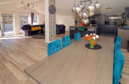 You will find your retreat from everyday life in this house nestled between rolling hills. A bright living room with a large dining table, a comfortable sofa area and a bar counter invite you to spend cosy hours with the family. Relax while listening to music, playing games or cooking together. Conjure up delicious meals together in the modern kitchen.
