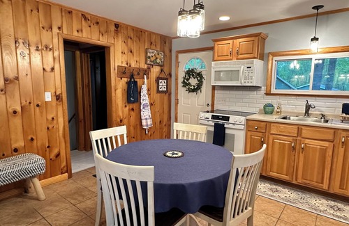 The Moon Glo Lake House is on the shores of Androscoggin Lake in Wayne, Maine. Wayne is a picturesque small town with a lovely downtown area with a bakery, ice cream shop, and general store all of which are within walking distance This lovely Maine lake house has three bedrooms and one bathroom. Upstairs boasts a sunny well-stocked kitchen and living room with a charming gas fireplace and two bedrooms (double and queen bed). And the best seat (for napping spot or reading a book) in the house, is a comfy window seat with an amazing view down the lake. A sunny wrap deck, outdoor dining space, and Weber grill set the stage for watching the sunsets and having late-night dinners. This lake house offers a second bright and airy living space downstairs with one bedroom (bunk beds and a double bed) with barn doors and a French door that provides easy access to the lake. This lake house has heat and ac, washer/dryer.