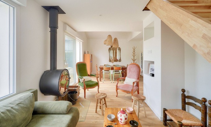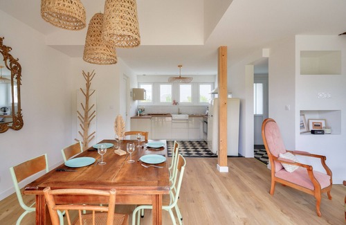For a change of scenery in southern Finistère, we offer you to discover Île Tudy, by staying in this lovely family house from the 60-70s. Freshly renovated with taste, combining modern comfort, beautiful family furniture and nicely dosed colour touches, this charming cocoon welcomes you with open arms. Entering, it smells of holiday memories! One can imagine sitting around the beautiful wooden table, to enjoy a good meal, prepared in the lovely open kitchen with a retro look.