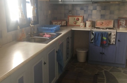 Lovely house located 0.5 km from the beach and 5 km from the port. It has both an amazing mountain view as well as sea view. The neighborhood is quiet helping you relax and enjoy your stay. It has a large living room and a large bedroom that can host up to 5 people.