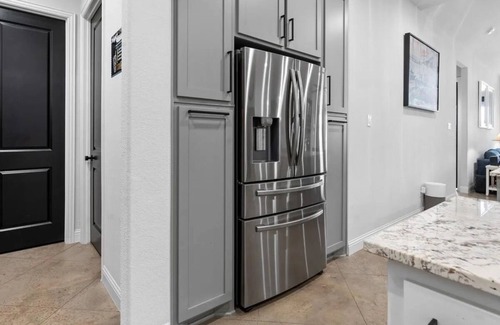 The master bedroom features a king size bed and large flat screen TV. The 2 downstairs bedrooms feature both a king and queen size bed and flat screen TVs. The upstairs bedroom has 4 QUEEN size bunk beds as well as sofa bed and gaming station. There are 3 full baths and one half bath as well as a small office and utility room with washer, dryer, additional refrigerator and a dog shower.