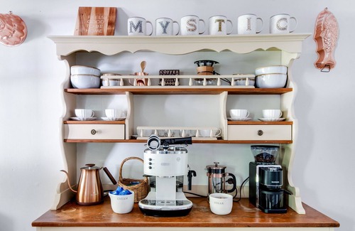 The home comes equipped with most of the things needed for a comfortable and enjoyable stay, notably a fully-equipped kitchen including a Delonghi espresso maker, French press, pour-over set up, blender, slow cooker, ample pots and pans, a full knife and cutlery set, plenty of dishware, and essential items for meal prep including olive oil, balsamic vinegar, and a fully-loaded spice rack. There is a also a brand new full-sized LG stacked washer and dryer set in the kitchen.