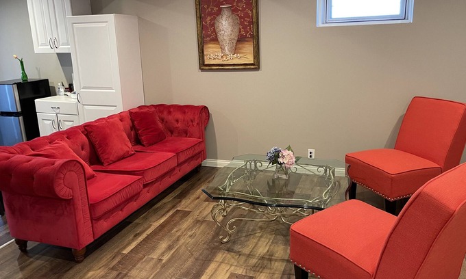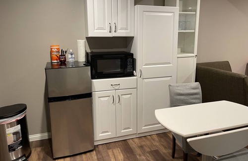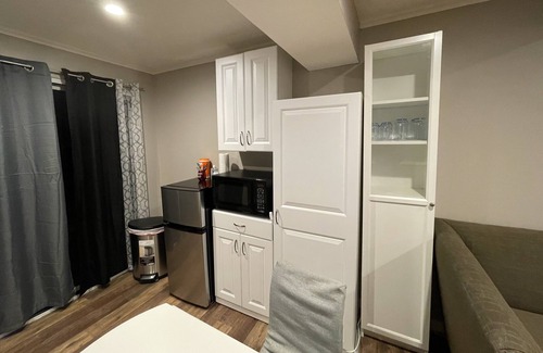 Hi there this is the house lower level where you will get one bed which is king size bed has a one full bath . tv lounge . Kitchen table with four Chairs 2 sofas chairs. Stove is not there but small fridge and microwave included . Also there is no kitchen sink included. No laundromat and also the upstair is occupied . The lower level has a separate entrance .