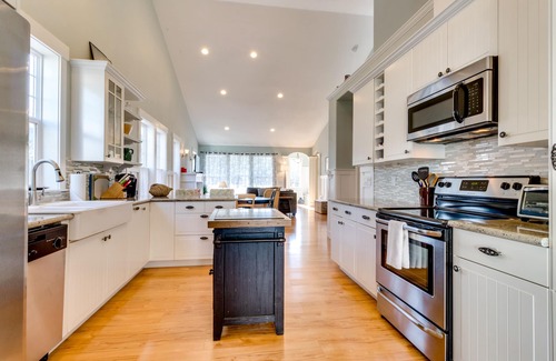 This three-bedroom, two-bathroom home is well equipped to host up to eight guests, and you're even welcome to bring two dogs with you (though please note that an additional fee will apply). Inside is a cozy interior with an open living area with plenty of seating and a TV set up with cable, Blu-ray/DVD players, and Netflix connectivity.