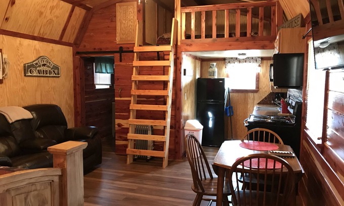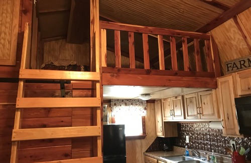 Lovely cozy secluded at the edge of the water and close to the woods for privacy. This cabin has a queen bed and a full bed in the loft so it will sleep 4 people, children love sleeping in the loft. The cabin has a full kitchen that is fully stocked with dishes, pans, coffee and everything else you need to cook. It has a large covered deck that is close to the water with a view of the vineyard and winery. It has a large TV and comfortable love seat, sheets and towels are provided. cell phone service is limited along with WIFI at the winery and sometime you can pick it up on the porch so it is the perfect place to relax and unplug.