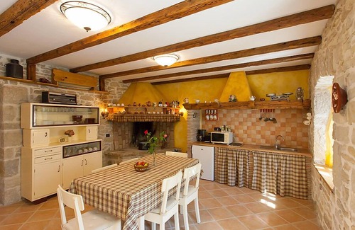 This comfortable villa is furnished in a rustic style and is located in the picturesque Istrian hinterland. The exterior of the villa is surrounded by a stone wall, which ensures absolute privacy during your stay on the pool terrace with its outdoor shower and deck chairs. The villa is particularly attractive because of its elegant interior in harmony with the surroundings. The living room is on the ground floor and the bedrooms on the first floor. The bathrooms are modern.