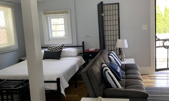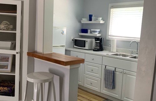 Cottage is steps away from downtown , Hoover Auditorium & Dock. Location is quiet, tucked behind main house & offers an outdoor courtyard with seating. Newly renovated cottage is fresh, clean & offers lots of natural light. Cottage has an open floor plan with a double bed, new futon, full kitchen, eating area, lounging area, window A/C, Cable/WIFI, bike storage, & large walk-in closet.