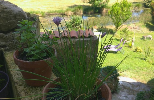 The small front terrace is gravel and has a table and 4 chairs for sunny breakfasts, at the rear there is a small shaded terrace and quite steep steps leading to a lawn with further table and chairs and barbeque. This has direct access to the shallow, slow moving river. Young children will need to be supervised at all times.