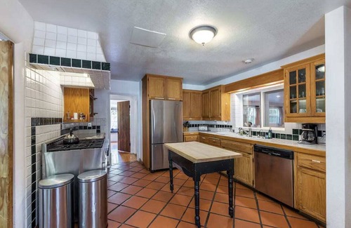 Discover the enchanting charm of Highland Manor, a Tudor-style retreat nestled among towering redwoods and lush gardens. The main house welcomes you with a cozy living room featuring a river rock fireplace, leather sofas, and a large flat-screen Smart TV with over 120 cable channels, including HBO. The gourmet kitchen is fully equipped with a large gas stove, reverse-osmosis water filtration, and an adjacent dining area with seating for over 10 guests. French doors from the kitchen and dining room open onto a sunlit pool deck.
