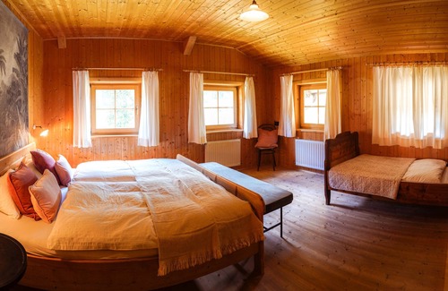 On the upper floor there are four cozy bedrooms, all paneled with wood as is usual in the farmhouses. In the largest of the rooms, in addition to the 1.80 m wide double bed, there is a single bed measuring 0.90 mx 1.90 m. In the other rooms there is enough space for 2 people each. We will be happy to prepare a hand-turned children's bed for you on request.