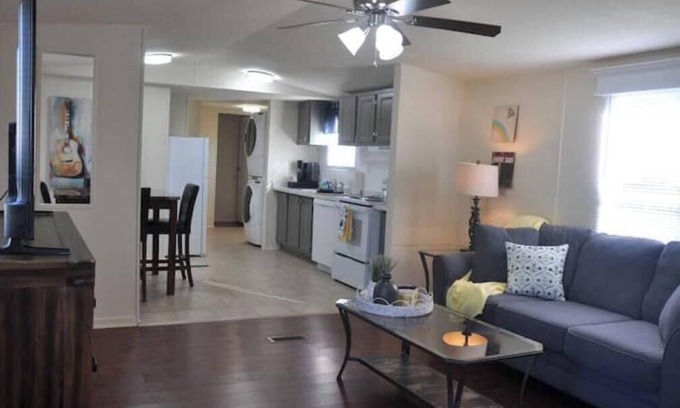 The main living area in this mobile home is open-concept and very comfortable and spacious. The living area boasts a 65-inch smart TV, a record player, and a cozy atmosphere. The well-appointed kitchen has new appliances, a keurig, and dining area. We leave a few snacks, waters, and coffee pods for your convenience.