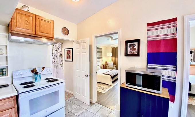 Welcome to San Diego's Taco Lovers Paradise. Don't be afraid of the low riders, murals, tattooed homes and the smell of fresh hand made tortillas and Carne Asada tacos, you're in the right place and everyone's cool 😉 Barrio Logan Heights is a neighborhood on the rise transformed by vibrant Mexican history, culture, art and food scene. This is a completely furnished duplex that is centrally located in San Diego and is an ideal place to call home for 30 days or more. Walk to the best food eateries in Logan Heights and Barrio Logan such as Las Cuatro Milpas, ¡SALUD TACOS!, Ciccia Osteria, Barrio Dogg, and Fish Guts. Spend the day at Balboa Park and the San Diego Zoo. Hop on a short uber ride to downtown or the convention center. Central location, Art vibe, and easy freeway access makes this special hideaway bookmark worthy. The space... 2 bed 1 bath, 627 square feet. Street Parking, laundry. 2 bedroom duplex residential neighborhood, each bedroom is furnished with queen beds, full-length mirror, 44 inch Smart TV in desk, chair, lamp, black out curtains, quiet ceiling fans, sound machine and extra blankets. Enjoy a fully equipped kitchen with stove, full size refrigerator, French press and coffee maker, rice maker, electric tea kettle. Home entrance access is from the alley entrance. Verizon 5G WIFI. Easy access to freeways.