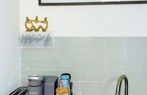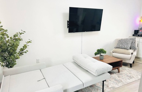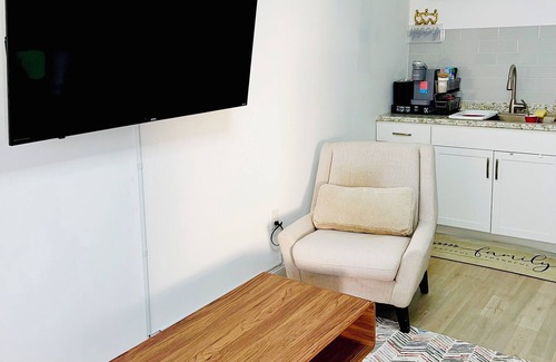 The home features a full-size/queen bed in the bedroom and a sleeper sofa in the living room, with an additional twin air mattress available for extra sleeping space. While the space is compact, it includes a fully equipped kitchen and a bathroom stocked with all the essentials.