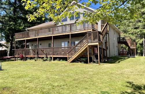 Bath, beach, kitchen towels, and bed linens provided extra pillows and blankets. The bathroom is stocked with shampoo, conditioner, and other toiletries. The kitchen contains dinnerware, utensils, cookware, coffee maker, reusable food containers, water bottles, and pantry items. A grill and seating can be found on the outside porch — the dining room table seats eight and four at the high-top counter. In the evening, relax around the fire or take a short walk down the road to the Happy Snapper, a local bar, and restaurant with a great view of Lake Mohawksin, great fishing, and 2000 acres of water to explore. Bars, Restaurants, ice cream, water ski show, bait shop, boat rentals, kayak rentals, and summer music in the park are all on this body of water. Lake Mohawksin Shores is also located 1.3 miles from downtown Tomahawk, with food, shopping, and entertainment opportunities during the day.