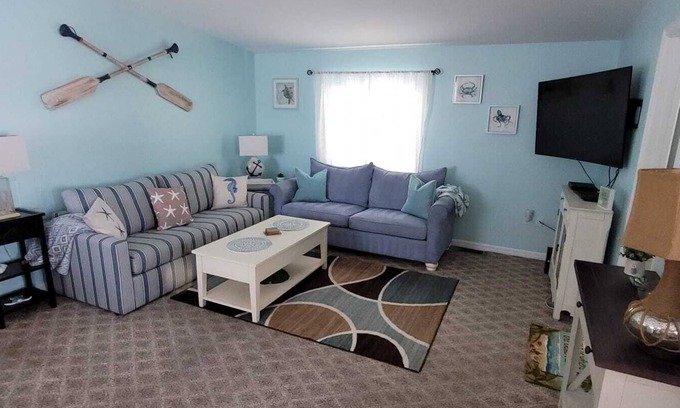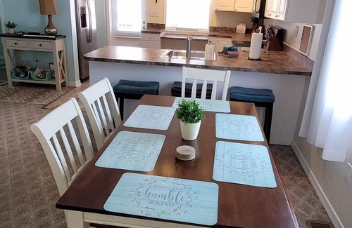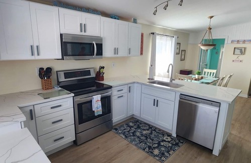 Kitchen is spacious with full size stove , microwave and dishwasher side by size stainless steel refrigerator with icemaker. Kitchen is fully stock for your comfort.