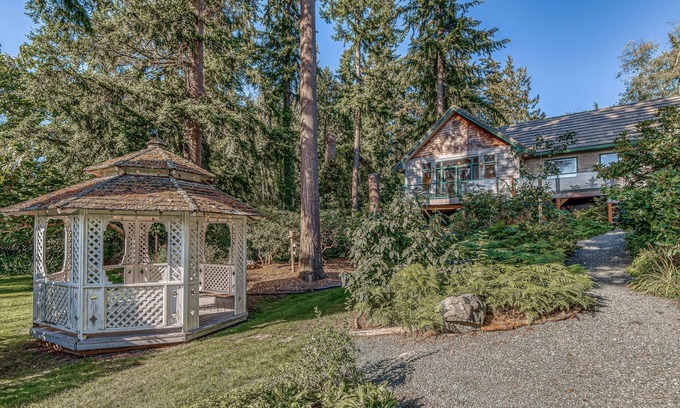 This lower-level veranda overlooks the gardens and native firs of the Quintessa Estate on Whidbey Island. Enjoy room to move indoors and outdoors with ease. From here your party can spill out into the deck and gardens. When visiting Whidbey, this is the place to bring the kids and their friends. This is the perfect vacation rental for a family reunion or a retreat with friends. You'll be able to take advantage of a convenient location close to all of the island's amazing offerings including beaches, farmers' markets, wineries, art galleries/studios, coffee roasters, and so much more! The Clinton-Mukilteo Ferry is only minutes from the estate and you'll be just 35 miles from Seattle's Space Needle.