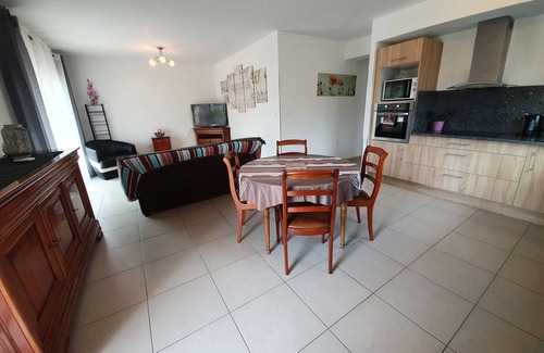 - A living room with American kitchen of 30 m² opening onto the terrace, TV, WIFI