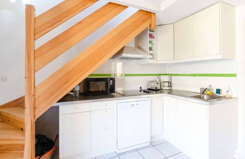 The living room has a dining table, sofa, TV with French channels, and a kitchenette (4-burner ceramic hob with extractor fan, traditional coffee maker, mini-oven/microwave, toaster, kettle, dishwasher, fridge with freezer compartment). A shower room with WC and washing machine is located on the ground floor.