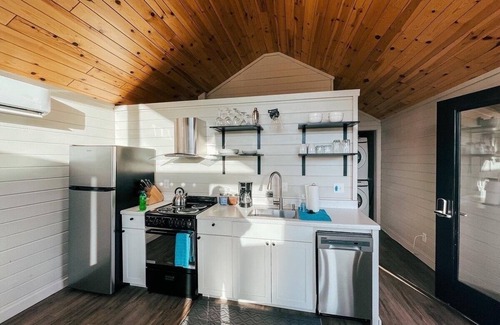 Queen bed, Twin-over-full bunk bed, futon sofa (single), wi-fi, tv, full kitchen, pots/pans/place settings, coffee maker, shower (no bathtub), basic pantry items (tea, coffee, sugar, salt, pepper, various spices, and more), a deck with furniture and trellis cover. The deck has a partial roof over the door (and slightly beyond) for foul weather.