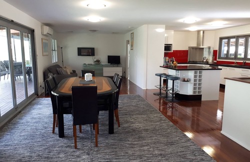 This impressive contemporary residence features spacious living areas designed for relaxation and celebration. The property boasts 3.5 beautifully appointed bedrooms with luxurious king beds, complemented by two large bathrooms equipped with a spa bath for ultimate pampering. The sleek kitchen seamlessly flows into the dining and living spaces, which open onto an enormous wrap-around deck—perfect for hosting intimate gatherings or larger wedding festivities. For entertainment, enjoy the separate living room featuring a pool table and grand piano, ensuring your loved ones are entertained throughout your stay.
