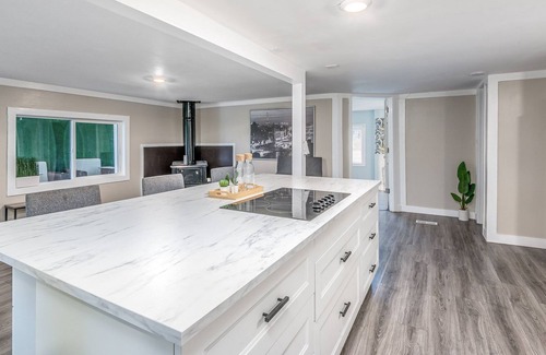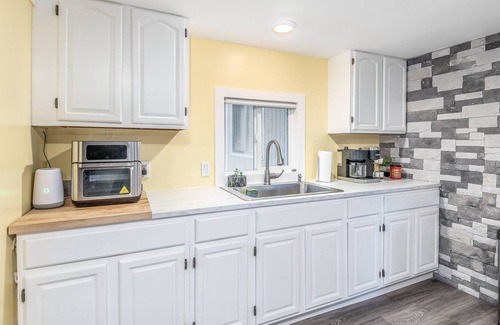 Home comes with a full stock kitchen with a brand new Keurig coffee machine. The layout of Lucid Fields kitchen is great for setting up a buffet style type. we put air fryer coffee machine on our counter. Toasters, blender extra air fryer, microwave will be stored away in cabinets if needed.