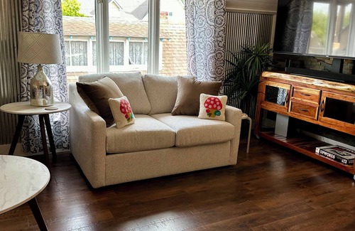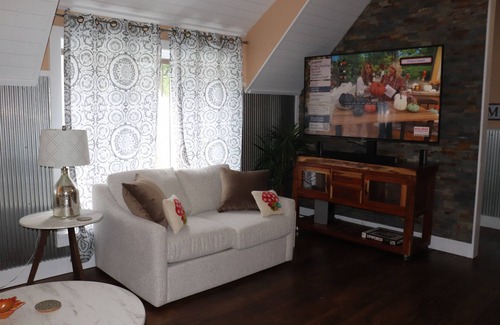 Brand new loft space above the famous Nashville Fudge Kitchen. Open and airy with high ceilings, offering amenities to make you feel at home. Take a flight of outside stairs to your magical view of the town of Nashville from the large windows in the living room and master bedroom. Relax on the outside deck, or cuddle up inside with our large 70" smart TV in the living room. This amazing space features 2 bedrooms, 1 bath and a kitchen to cook up your favorite meal. An ideal girlfriends getaway, a relaxing getaway for 2 or enough space for 2 couples .