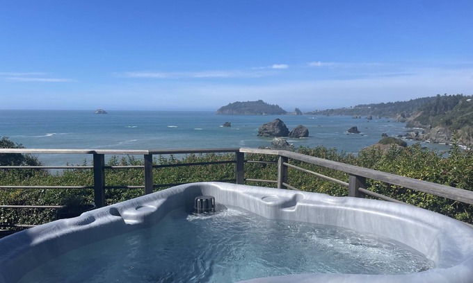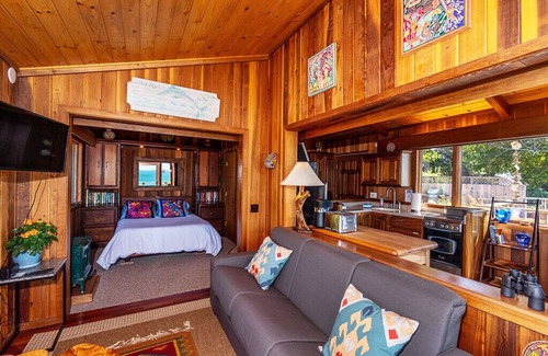 Rest and recharge at this charming seaside cabin located two miles south of Trinidad. Great romantic getaway for 1 or 2 couples. The main cabin has a one room floor plan designed by by a sailor, and has a cozy, nautical vibe. The Queen-sized bed is comfortable with top notch bedding for your comfort. This cabin has one full bathroom with a walk in shower. There is a second detached, small bedroom with a new Queen bed offers beautiful ocean views and a 1/2 bathroom. There is a fully fenced yard for one well behaved dog. The kitchen/galley is small but fully equipped for preparing delicious meals. Together with a propane bbq for easy grilling, you may dine inside, or al fresco on the deck to the sounds and sights of the sea! As sunset approaches enjoy a glass of wine from Tepona Point, directly across the street from your private driveway. Soak up the relaxation and sweeping ocean views from the 2 person hot tub! You may never want to leave! You can relax and explore for days and never get in your car.