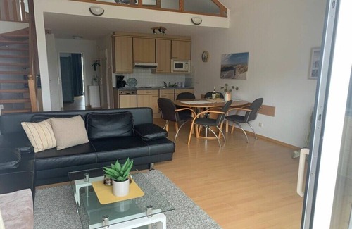 The holiday apartment is located in a well-maintained apartment building directly on the beach in Holnis. It can accommodate a total of 6 people. The property is on the 1st floor. The bright and very spacious living room offers a large dining area and a seating area with two leather sofas. These can be used as sofa beds. The balcony is furnished and, like the living room, offers direct sea views. The beach is directly in front of the holiday home. The kitchen is integrated into the living room and has everything guests need for self-catering. A dishwasher is available. The bedroom on the 1st floor is furnished with a double bed, wardrobe, and chest of drawers and facing the rear, towards the meadows. This bedroom also has a small balcony. The second bedroom is located in the open attic and is accessed via a staircase in the living room. This upper sleeping area is open, like a gallery. It is also furnished with a double bed and a wardrobe. Two large skylights and the gallery provide plenty of light. A desk and a recliner are also available for our guests. The shower room on the first floor is also equipped with a washing machine. A private parking space is available at the holiday home.