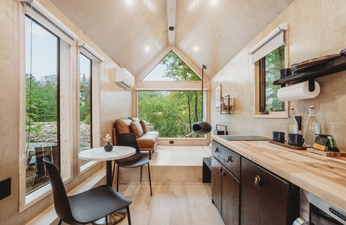 Our Nordic inspired Cabin HYGGE provides you with a bedroom-in-nature concept featuring a full-wall window, cozy fireplace and a relaxation nook, full kitchenette, along with a luxury, hotel-quality queen bed and a loft bed.