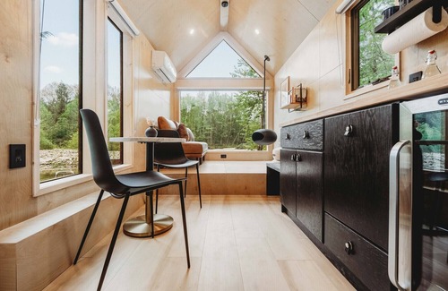 Our Nordic inspired Cabin HYGGE provides you with a bedroom-in-nature concept featuring a full-wall window, cozy fireplace and a relaxation nook, full kitchenette, along with a luxury, hotel-quality queen bed and a loft bed.