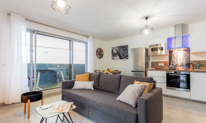 Luminescence, large and beautiful by its volumes, you stay at the foot of Marianne Park where you can stroll or ride a bike. Large living room open kitchen, double exposure. Fully equipped kitchen, washing machine, dishwasher, microwave oven, classic oven, fridge, freezer, ceramic hob etc. The apartment is equipped with fiber and wifi. A room with a large bed 160, a sofa bed very comfortable for friends. Beautiful and large terrace for lounging.