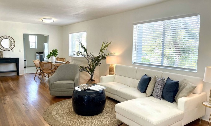 Welcome to Luna beach bungalow! Just steps away from the beach, shops, resturants, & Bal Harbour. This spacious 2 bedroom 2 bath corner unit apartment offers an abundance of natural lighting, it comes fully furnished and equiped. Located in the NOBE neighborhood on Miami Beach in middle of all the action. Features include: Gated/private entrance, parking available, Self Check-in, & a free trolley near by. 5 minute walk to Surfside beach & 15-20 minute car ride to South Beach. The unit is on the 2nd floor with no elevator access