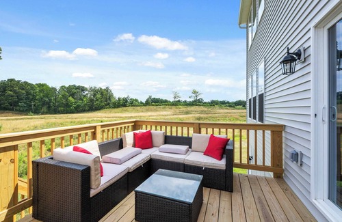 After your adventures, come back home to Lunar Haven to enjoy a quiet glass of wine on the deck or a meal al fresco on the patio, gazing out at the peaceful surrounding landscape while soaking in that fresh country air. Indoors, soaring vaulted ceilings sit atop spaces designed for relaxation and connectivity, where contemporary furnishings meet chic décor to elevate not only the environment but your mood as well. Sink into plush sofa or armchair seating in the living room while you stream episodes of all your favorite shows on the mounted smart TV. The showpiece fireplace serves both form and function, keeping you toasty during the cooler months. Thanks to the open layout, the kitchen is just steps away, showcasing stainless steel appliances, glossy stone countertops, and sleek cabinetry stocked with all the comforts of home. Gather the whole crew for dining at the formal table with seating for 8 alongside serene views of the great outdoors.