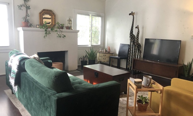 This 100-year old bungalow sits on a quiet street next to Larchmont Village, the Hollywood Forever Cemetery, and Paramount Pictures Studio-- definitely has some old Hollywood history! The two bed 2 bath house is painted green and has a lush yard and large front porch. The furniture is mostly mid-century and antique. The living room has newly installed dark wood flooring and a unique crosshatched beam ceiling accompanied by a stunning white fireplace. Sunlight shines through casement windows onto the various houseplants. The master bedroom has a lush bamboo garden view. There is also an attached vanity with a large mirror and a bathroom with an above-ground tub. The second bedroom has large casement windows and a view of the backyard. This room has a beautiful warm and sunny feel with unique built-in white cabinetry. There is a grapefruit tree in the shared yard and you are welcome to eat as many as you please :)