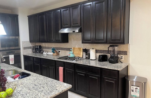 Welcome to our very spacious 4100 sq ft contemporary home, conveniently located on San Antonio's expanding northwest sector, very near Seaworld, and a short trip to Six Flags. Combining country living with city living, you can easily feel the charming atmosphere of the area. The home features a home theater, a large game room, a spacious backyards and coveted amenities perfect for group trips. This home is made for enjoyment, whether on vacation, on a business trip, on a get-away trip, or even if you live in town and are looking to spend a few days out of your home with family and friends.