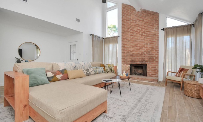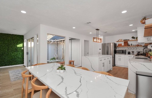Equipped with three luxurious bedrooms and two stylish bathrooms, this home comfortably sleeps up to eight guests. Enjoy the ease of self-check-in with a keyless lock, and take advantage of the fully stocked kitchen to create delightful meals. The living room features a sectional made from twin-sized mattresses for extra sleeping space, while the large private patio, adorned with hammocks and cozy seating, provides a serene setting for relaxation and mingling. Additional amenities include fast Wi-Fi, multiple Fire TVs, complimentary tea and coffee, and convenient on-site laundry facilities, ensuring your stay is as seamless as possible.