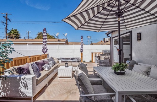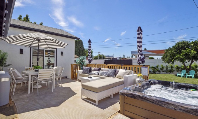 You've found your perfect home for enjoying your LA vacation or gathering. This beautiful 4-bedroom home has two master suites, two king beds, and plenty of space for everyone. The beautiful backyard is designed as a relaxing space with outdoor dining tables and a lux grill, a 61-jet Calspa hot tub that seats 7, a lounging area for relaxing, and a corn hole game for family fun. The house is also conveniently located close to all LA attractions and beaches. It is close to retail, groceries, and restaurants.