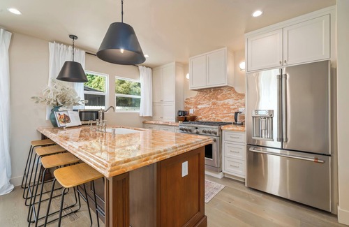 Has a galley-style chef’s kitchen with counter-depth refrigerator, filtered water/ice dispenser, gas stove, microwave oven, dishwasher, toaster, Keurig K-cup, De’Longhi Combination Expresso and Coffee Pot Maker, and a juicer. The kitchen is fully stocked with cooking and eating essentials.